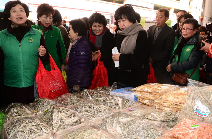 27일 오후 대구 중구 서문시장에서 설 명절 전통시장 장보기 캠페인에 나선 윤순영 중구청장(가운데)을 비롯한 공직자와 협의단체회원이 차례용품을 구매하고 있다. /뉴시스
