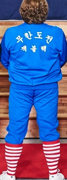공개된 사진 속에는 잭블랙이 '무한도전 잭블랙'이라는 한글이 새겨진 파란색 트레이닝복을 입고 뒤돌아 서있는 모습이 담겨있다. 특히 잭블랙의 트레이닝복 하의가 엉덩이 속에 파뭍힌 모습이 보는 이들의 폭소를 자아냈다.