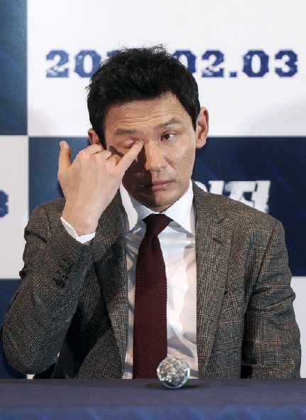황정민은 지난 25일 깔끔한 회색정장에 버건디 넥타이로 멋지게 나타났다. 그러나 그는 곧 제작발표회 도중 약지로 눈꼽을 떼는 듯 한 모습을 보여 웃음을 자아냈다.