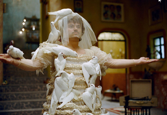 잭블랙은 사진 속에서 양 손에 비둘기용 먹이를 쥐고 비장한 표정으로 흰 비둘기들에게 먹이를 주고 있다. 그는 마치 비둘기 드레스를 입은 듯한 코믹한 모습으로 깜짝 놀라게 했다.