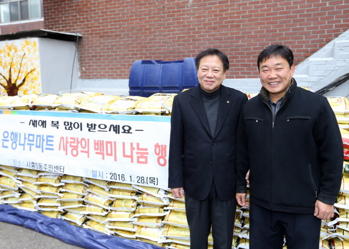 최근 서울 금천구 시흥5동 주민센터는 ‘사랑의 백미 나눔 행사’를 진행했다. 사진은 행사에 참석한 차성수 구청장(왼쪽)과 이번에 쌀을 기탁한 노수봉 은행나무마트 대표의 모습.(사진제공=금천구청)