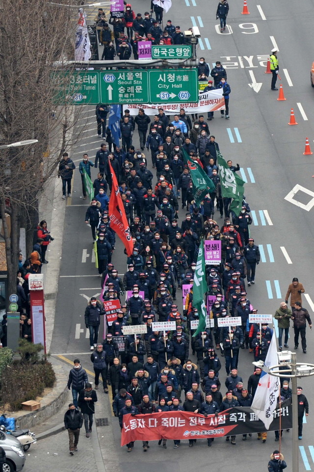한국노동조합총연맹 회원들이 29일 오후 서울 중구 서울역 광장에서 열린 '정부지침 분쇄! 노동개악 저지! 한국노총 총력투쟁 결의대회'를 마친 뒤 서울광장으로 행진을 하고 있다.