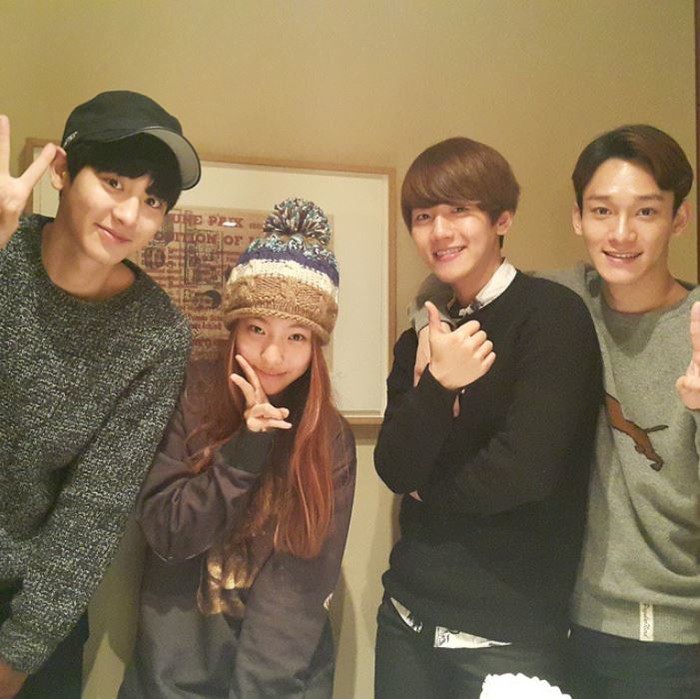 사진 속에는 엑소 멤버 찬열, 백현, 첸 사이에서 브이 포즈를 취하고 있는 이진이의 모습이 담겨있다. 특히 세 사람의 환한 미소가 눈길을 끈다.