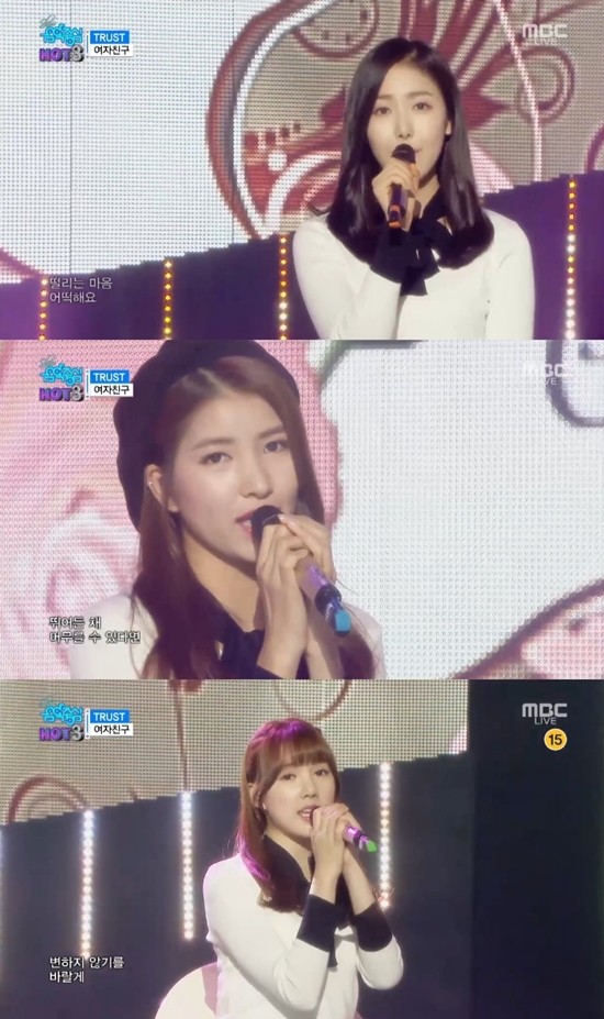 여자친구는 30일 오후 방송된 MBC ‘쇼! 음악중심(이하 음악중심)’에 출연, 퍼포먼스 위주인 '시간을 달려서' 무대에 앞서 팝발라드의 감성적인 멜로디가 인상적인 '트러스트'의 무대를 선보였다.