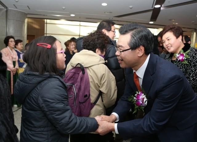 | ▲ 성장현 구청장이 '2016 신년인사회'에서 한 어린이와 눈을 맞추고 대화를 나누고 있다. 구는 올해도 복지사각지대 발굴을 위해 다양한 사업을 추진할 방침이다. | ||