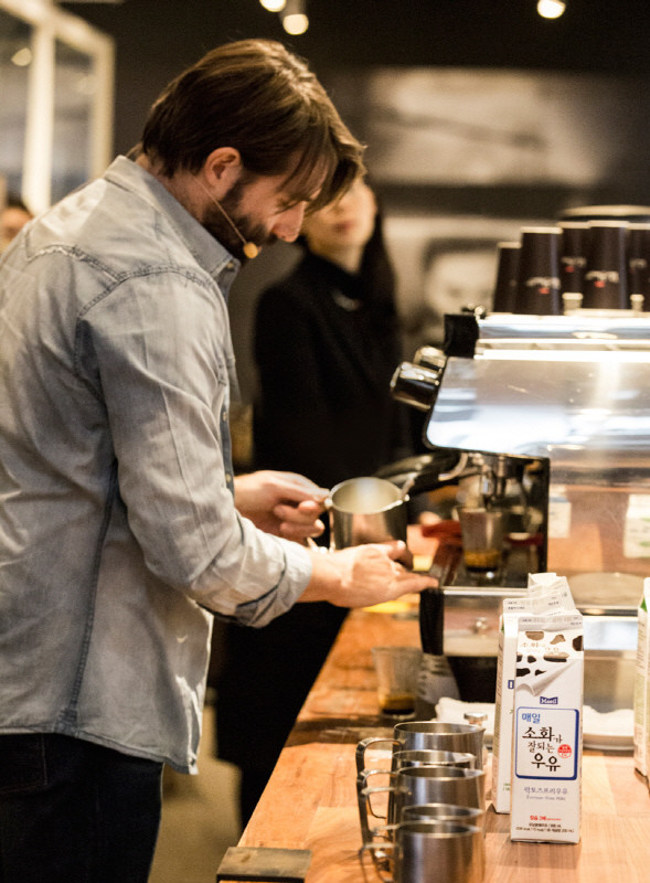 | ▲ 폴 바셋이 매일 소화가 잘되는 우유를 이용해 커피시연을 하고 있다. | ||