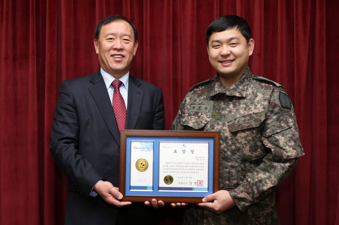 1일 경기 가평군은 군청 회의실에서 군청 관계자 250여명이 참석한 가운데 2월 월례조회를 열었다. 사진은 이날 조회에서 김성기 군수(왼쪽)와 민방위 비상급수시설에 헌신적으로 참여한 공로로 표창을 받은 최경준 상사가 기념촬영을 하는 모습.(사진제공=가평군청)