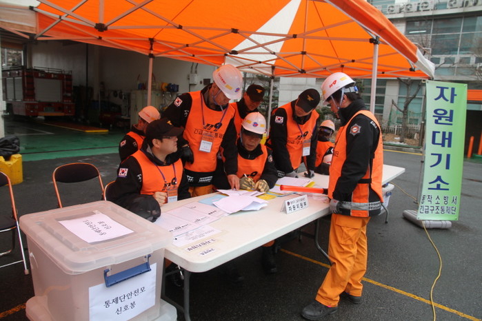 최근 서울 동작소방서는 소방서 2층 소회의실 및 후정에서 동작구청, 동작보건소 등 유관기관 합동 긴급구조종합훈련 도상 및 가상훈련을 실시했다. 사진은 훈련에 참석한 관계자들이 회의하는 모습.(사진제공=동작소방서)