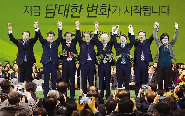 국민의당 안철수, 천정배 공동대표가 2일 대전 중구 한밭체육관에서 열린 중앙당 창당대회에서 총선 승리를 다짐하며 손을 들어보이고 있다. 왼쪽부터 박주선 최고위원, 주승용 최고위원, 천 대표, 한상진 공동 창당준비위원장, 김한길 상임 선대위원장, 안 대표, 김성식 최고위원, 박주현 최고위원.