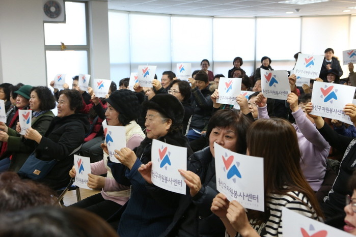 용산구가 지난 1일 '2016년 한국자원봉사의 해'를 맞아 '퍼져라 자원봉사 물결! 커져라 시민의 힘'이라는 슬로건 아래 용산구자원봉사센터 교육장에서 '자원봉사 물결운동 출정식'을 개최한 가운데 구민과 자원봉사자들이 물결운동을 상징하는 그림이 들어간 카드를 들고 있다. (사진제공=용산구청)