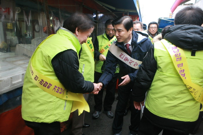 서울 강동구는 지난달 29일 둔촌역 전통시장에서 ‘안전점검의 날’ 캠페인을 실시했다. 사진은 행사에 참석한 이해식 구청장(가운데)이 민·관 협력 거버넌스 회원과 악수를 나누는 모습. (사진제공=강동구청)