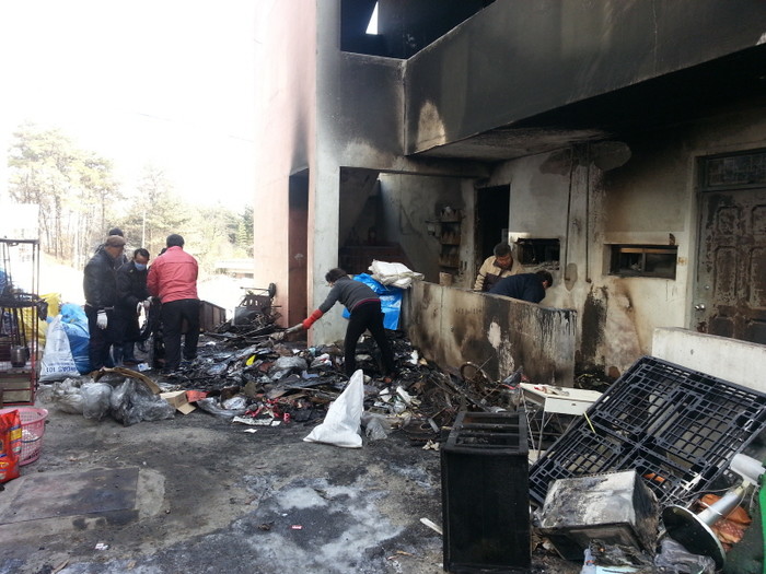 최근 경기 이천시 증포2통 주민 30여명은 화재가 발생한 홀몸노인 집을 찾아 봉사활동을 진행했다. 사진은 봉사에 참여한 관계자들이 화재로 타버린 물건들을 치우는 모습.(사진제공=이천시청)