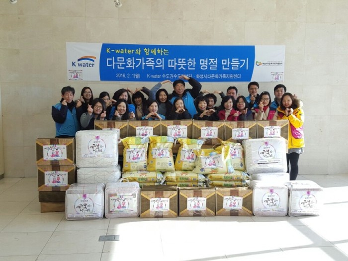 지난 1일 경기 화성시다문화가족지원센터와 K-water 수도권수도건설단 임직원 20여명은 지역내 다문화가정을 방문해 ‘설맞이 사랑나눔 행사’를 진행했다. 사진은 행사에 참석한 관계자들이 기념촬영을 하는 모습.(사진제공=화성시청)