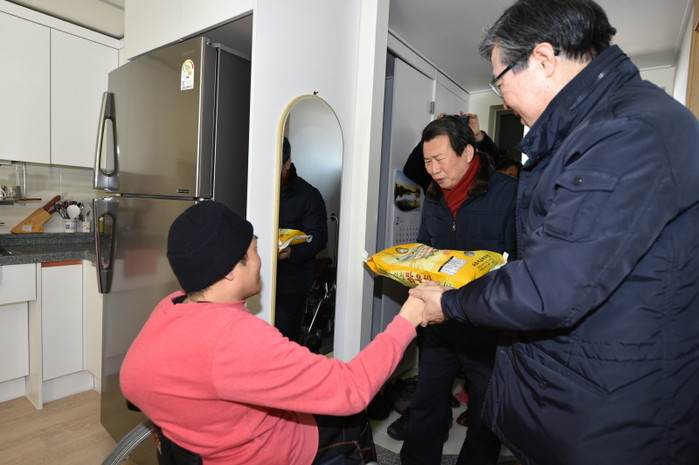 지난 2일 오전 나진구 서울 중랑구청장(가운데)이 지역내 신내의료안심주택을 방문해 주민들에게 사랑의 쌀을 전달하고 있다. 후원물품인 2230만원 상당의 사랑의 쌀 1000포는 구 ‘영안복지재단’에서 기부했다.(사진제공=중랑구청)
