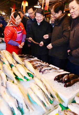 국민의당 안철수·천정배 공동대표와 주승용 최고위원이 3일 서울 동작구 노들로 노량진수산시장을 방문해 상인들과 대화를 나누며 수산물을 살펴보고 있다.