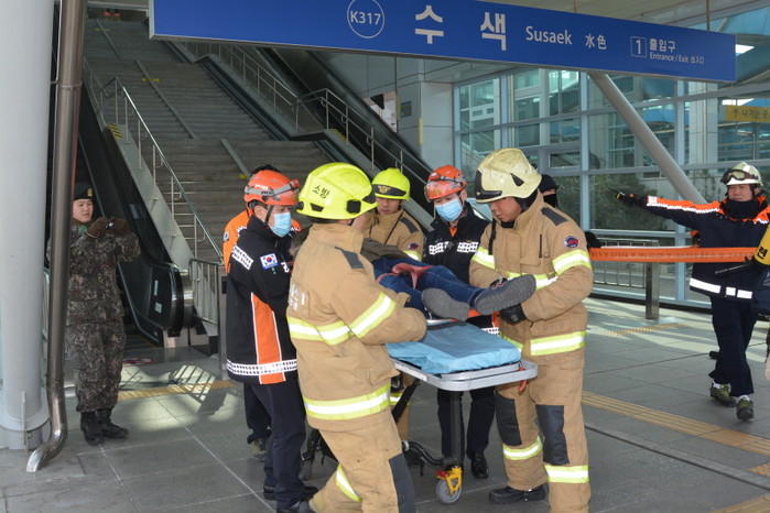 3일 서울 은평소방서는 수색역 일대에서 군·경찰 등 11개 기관 및 단체 합동으로 야외기동훈련(FTX)을 실시했다. 사진은 훈련에 참가한 관계자들이 인명구조·구급활동 훈련을 하는 모습.(사진제공=은평소방서)