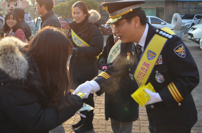 4일 경기 김포경찰서는 김포고등학교에서 졸업식 뒤풀이를 근절하고 건전한 졸업식 문화의 정착을 위한 합동 캠페인을 실시했다. 사진은 이봉행 서장이 학생들에게 홍보물품을 전달하는 모습.(사진제공=김포경찰서)