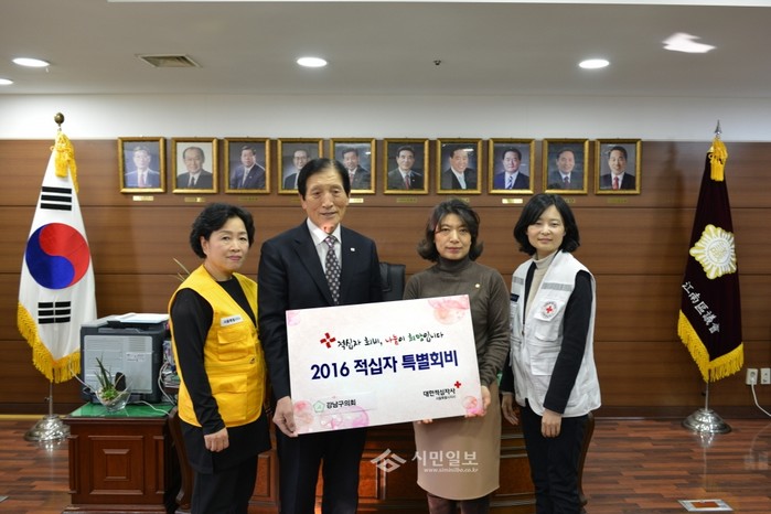 지난 2일 서울 강남구의회는 김명옥 의장(오른쪽에서 두 번째)을 비롯한 대한적십자사 서울특별시지사 제타룡 회장(왼쪽에서 두 번째)과 서초강남봉사센터 적십자 회원들이 참석한 자리에서 제 회장에게 ‘2016년 적십자 특별회비'를 전달했다.(사진제공=강남구의회)
