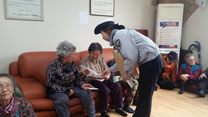 4일 인천중부경찰서는 설을 맞아 동구노인복지회관 등 3곳 노인복지시설을 방문해 교통사고예방을 위한 보행 안전수칙 및 성폭력예방 교육을 실시했다. 사진은 관계자가 노인에게 보행시 주의사항에 관한전단지를 전달하는 모습.(사진제공=인천중부경찰서)