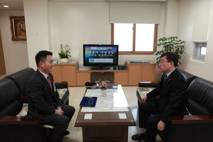 4일 경기 수원시 권선구는 설을 맞아 중앙양로원 방문을 시작으로 저소득 이웃 4가구를 방문해 따뜻한 마음을 전하는 시간을 보냈다. 사진은 박흥수 구청장(오른쪽)이 양로원 관계자와 대화를 하는 모습.(사진제공=권선구청)
