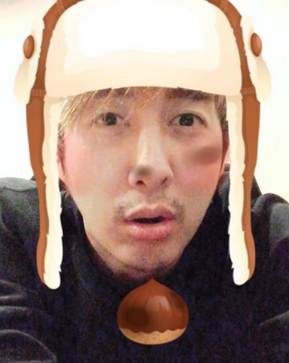 사진 속 그는 군밤장수의 모자를 쓴 채 카메라를 응시하고 있다. 밤과 군밤장수의 모자는 카메라 어플의 스티커다.