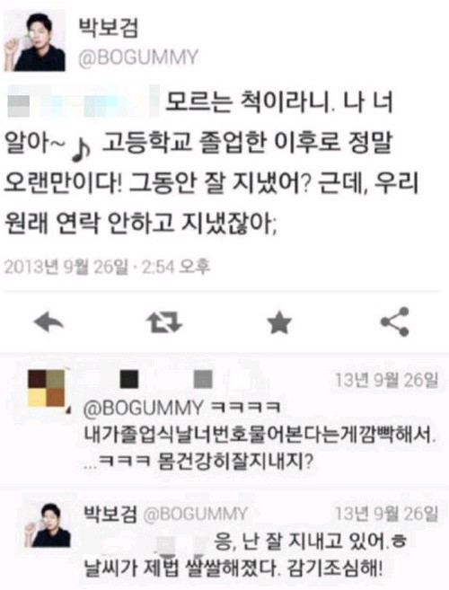 박보검은 이를 보고 "모르는 척이라니. 나 알아~ 고등학교 졸업한 이후로 정말 오랜만이다. 그 동안 잘 지냈어? 근데, 원래 연락 안 하고 지냈잖아"라고 답하며 동창에게 일침을 가했다.