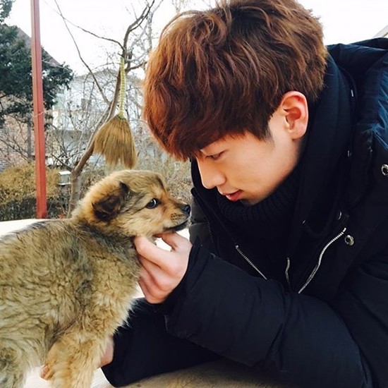 공개된 사진 속 서강준은 작은 강아지의 턱을 쓰다듬으며 강아지를 쳐다보고 있다.