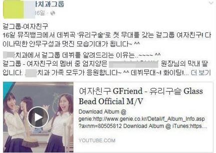 해당 SNS에는 "16일 뮤직뱅크에서 데뷔곡 '유리구술'로 첫 무대를 갖는 여자친구! 다이나믹한 안무 구성과 멋진 모습 기대가 됩니다"라는 글과 함께 뮤직비디오 영상을 올려져 있었다. 더불어 "걸그룹 데뷔를 알려드리는 이유는 멤버 중 엄지 양이 원장님의 막내 딸입니다"라고 덧붙여 놀라움을 자아냈다.