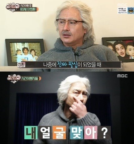 안정환은 이날 39년 후 미래로 떠나 주름진 얼굴과 백발의 80세 노인으로 변신했다.