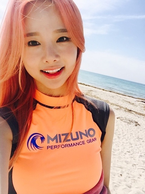 사진 속 솔지는 환한 미소를 지으며 머리 색과 비슷한 주황색 래쉬가드를 입고 있다.