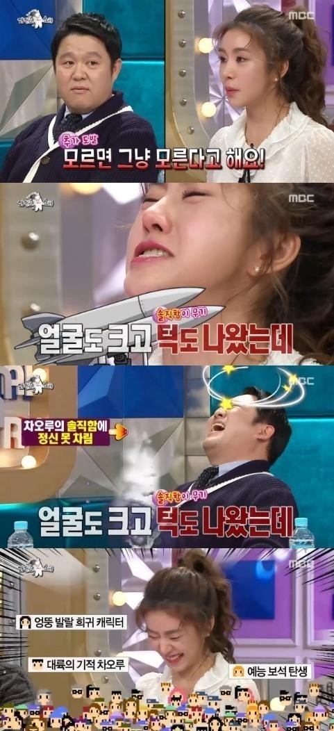 차오루는 또 개인기로 눈물 연기를 꼽으며 즉석 상황극에 도전했다. 차오루는 김구라를 보며 "아저씨 잘 생긴 줄 알았냐. 아저씨 못 생겼다. 우리 아저씨 어떡하냐. 턱 나오고 머리도 크고 어떡하냐"고 말하며 눈물을 흘리는 등 특이한 예능감을 뽐냈다.