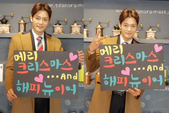 김진우는 공개 된 사진 속에서 '메리크리스마스, 해피뉴이어'가 적힌 종이를 들고 훈훈한 얼굴로 카메라를 바라보고 있다.