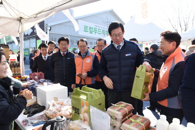 | ▲ 한전 조환익사장(오른쪽 두번째) 나주 로컬푸드 장터에서 물건을 구매하는 모습. | ||