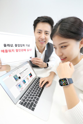| ▲ KT는 졸업 및 입학 시즌을 맞이해 오는 3월 1일까지 ‘애플워치 할인 판매’ 이벤트를 진행한다. 사진은 모델들이 ‘애플워치’를 착용하고 올레샵을 통한 할인판매를 소개하고 있다. | ||