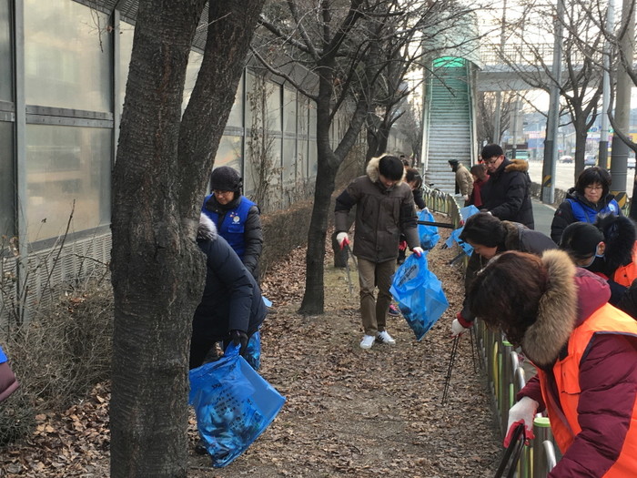 최근 경기 의정부시 송산1동 주민센터는 송산1동 주민자치위원, 통장, 새마을지도자협의회 등 각 단체 120여명이 참석한 가운데 부용천변 및 용현로 일대에서 설맞이 일제 대청소를 실시했다.(사진제공=의정부시청)