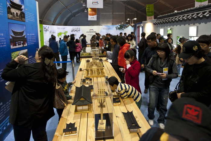 | ▲ '한옥건축박람회'에 참가한 관객들이 전시품을 살펴보고 있다. | ||