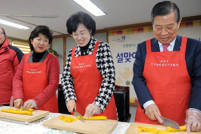 최근 박춘희 서울 송파구청장(가운데)이 구청 대회의실에서 북한이탈주민들이 송파구에 정착하는 데 어려움이나 건의사항 등 애환을 듣고 격려하는 등 다양한 행사가 진행된 ‘설맞이 남·북 사랑나눔’ 행사에 참석해 북한이탈주민들과 떡썰기 체험을 하고 있다. (사진제공=송파구청)