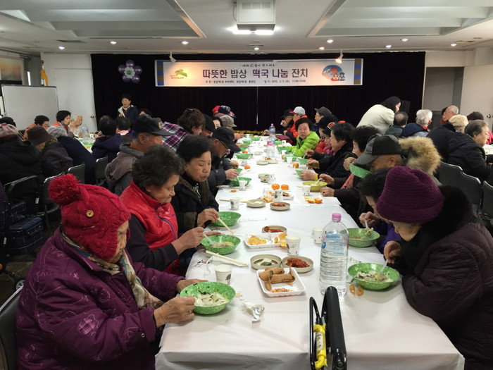 최근 서울 은평구 응암제1동 주민센터에서는 지역내 홀몸노인 등 소외계층 150여명을 초청해 '따뜻한 밥상, 떡국 나눔 행사'를 마련했다. 사진은 행사에 참석한 노인들이 식사를 하는 모습.(사진제공=은평구청)