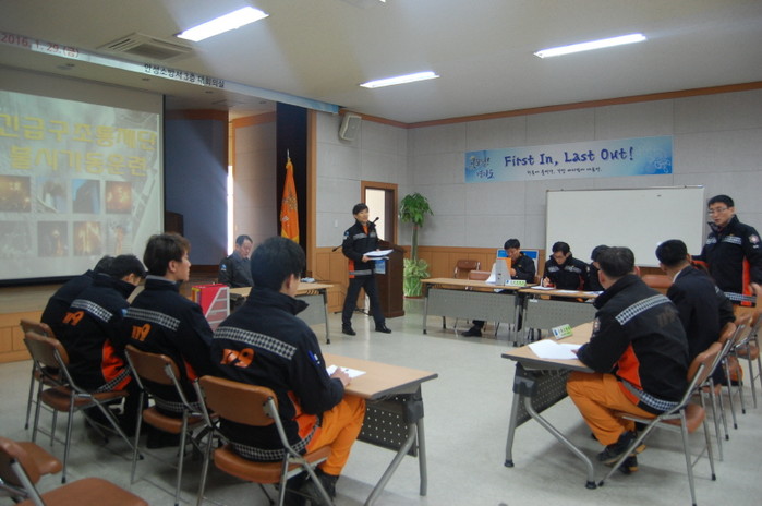 경기 안성소방서는 11일 대회의실에서 소방공무원 80여명이 참석한 가운데 재난현장 대응 역량 강화를 위한 불시 통제단 가동훈련을 실시했다. 사진은 훈련에 참석한 관계자들이 회의를 하는 모습.(사진제공=안성소방서)