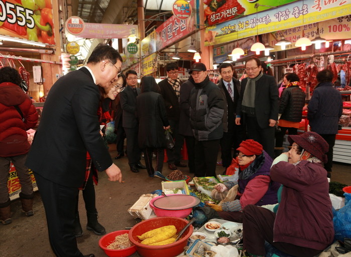 최근 전남교육청은 재래시장인 목포시 산정동 동부시장에서 설 명절 장보기 행사를 진행했다. 사진은 행사에 참석한 장만채 교육감(왼쪽)이 시장 상인과 대화를 하는 모습.(사진제공=전남교육청)