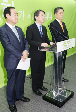안철수 국민의당 공동대표와 주승용 원내대표, 장병완 정책위의장이 11일 오전 서울 마포구 당사에서 1호법안인 ‘낙하산 금지법’ 등을 발표하고 있다.