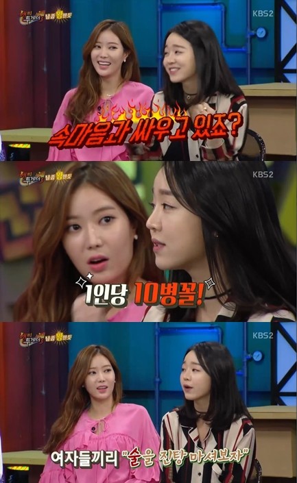 그는 이어 “친구들과 함께 ‘여자들끼리 진탕 마셔보자’는 마음으로 먹었다”고 말했다. MC들은 설명하는 그의 모습을 보고 “행동만 봐도 어땠는지 알겠다”고 덧붙이며 웃음을 자아냈다.