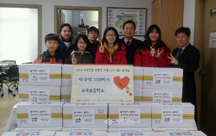 서울 강동구에 위치한 묘곡초등학교는 이웃돕기 성금으로 마련한 떡국떡 100상자(200만원 상당)를 고덕1동 주민센터에 기탁했다. 사진은 관계자들이 기념촬영을 하는 모습.(사진제공=강동구청)