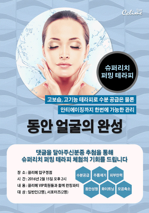 끌리메 압구정점 관계자는 “슈퍼리치 퍼밍 테라피를 체험할 수 있는 기회이며, 오시는 모든 분들께 26만원 상당의 S오일도 선물로 제공하고 있다”라며 “참여방법 또한 쉬우니 댓글을 많이 달아달라”고 전했다.