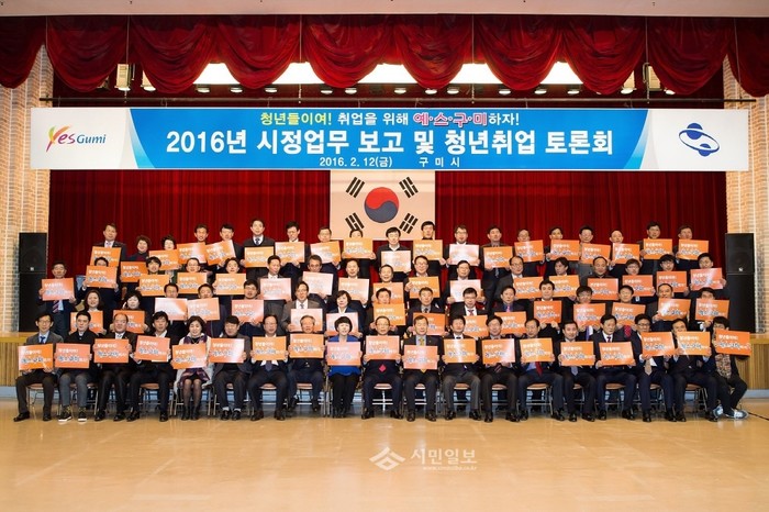 지난 12일 경북 구미시에서는 시청 대회의실에서 5급 이상 간부 등 100여명이 참석한 가운데 ‘2016년 시정업무 보고 및 청년취업 토론회’를 개최했다. 사진은 남유진 시장(앞줄 가운데)을 비롯한 관계자들이 기념촬영을 하는 모습.(사진제공=구미시청)