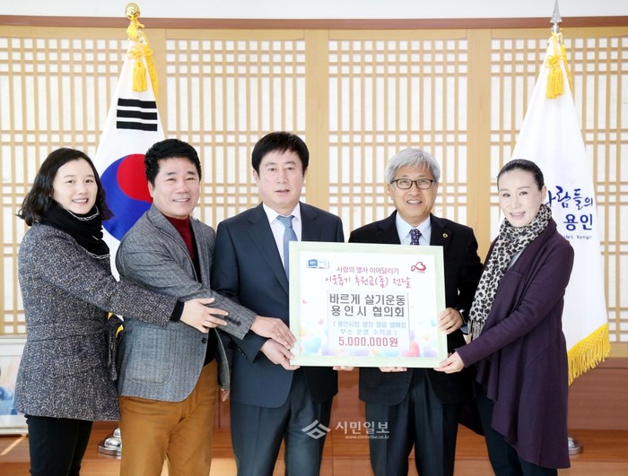 15일 바르게살기 운동 용인시협의회는 경기 용인시에 불우이웃을 위해 사용해달라며 시청 썰매장 먹거리 판매 수익금 500만원을 기부했다. 사진은 정찬민 용인시장(가운데)과 관계자들이 기념촬영을 하는 모습.(사진제공=용인시청)