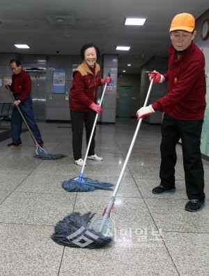 | ▲ '어르신 행복 주식회사'에 채용된 노인들이 구민체육센터에서 청소를 하고 있다. | ||