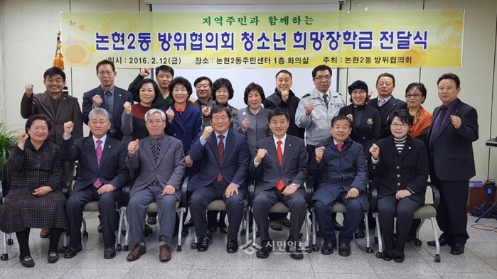 지난 12일 서울 강남구는 논현2동 주민센터에서 18명의 북한이탈청소년들에게 꿈과 희망을 전하는 장학금 전달식을 진행했다. 사진은 행사에 참석한 관계자들이 기념촬영을 하는 모습.(사진제공=강남구청)