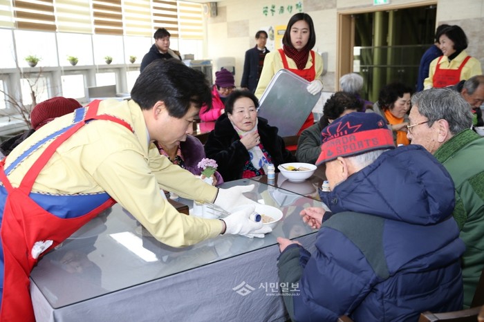 16일 나상성 경기 광명시의회 의장(왼쪽)은 광명종합사회복지관에서 열린 '사랑의 짜장차' 나눔봉사에 시의원들과 함께 동참해 노인들을 대상으로 자장면 배식 봉사를 진행했다.(사진제공=광명시의회)