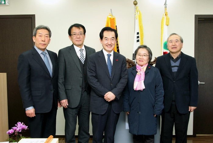 지난 15일 안병용 경기 의정부시장은 의정부고등학교 박영운 교장과 신한대학교 노운녕 교수를 의정부시공직자윤리위원회 신규회원으로 위촉했다. 사진은 안 시장(가운데)과 관계자들이 기념촬영을 하는 모습.(사진제공=의정부시청)